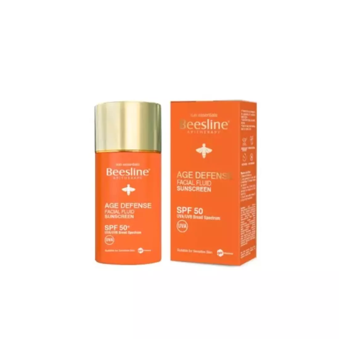 beesline age defense facial fluid invisible spf50+ :Une formule 3 en 1 qui offre une protection à large spectre UVA, UVB et IR.