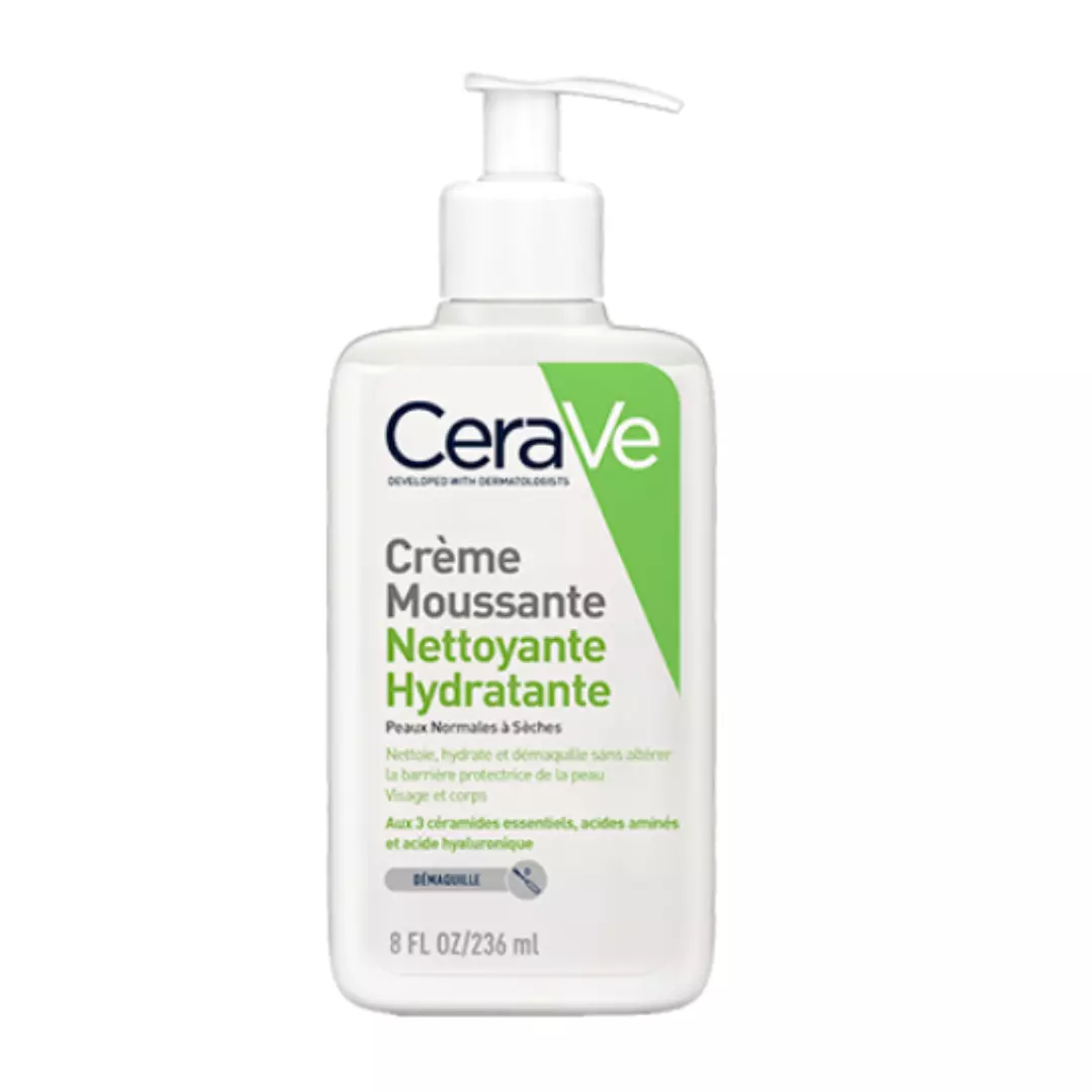 DEVELOPPEE AVEC DES DERMATOLOGUES LA CREME MOUSSANTE NETTOYANTE HYDRATANTE CERAVE NETTOIE, DEMAQUILLE ET HYDRATE TOUT EN RESPECTANT LA BARRIERE PROTECTRICE DES PEAUX NORMALES A SECHES. TEXTURE CREME EN MOUSSE ONCTUEUSE ET ENVELOPPANTE. FORMULE VISAGE ET YEUX. SANS PARFUM.